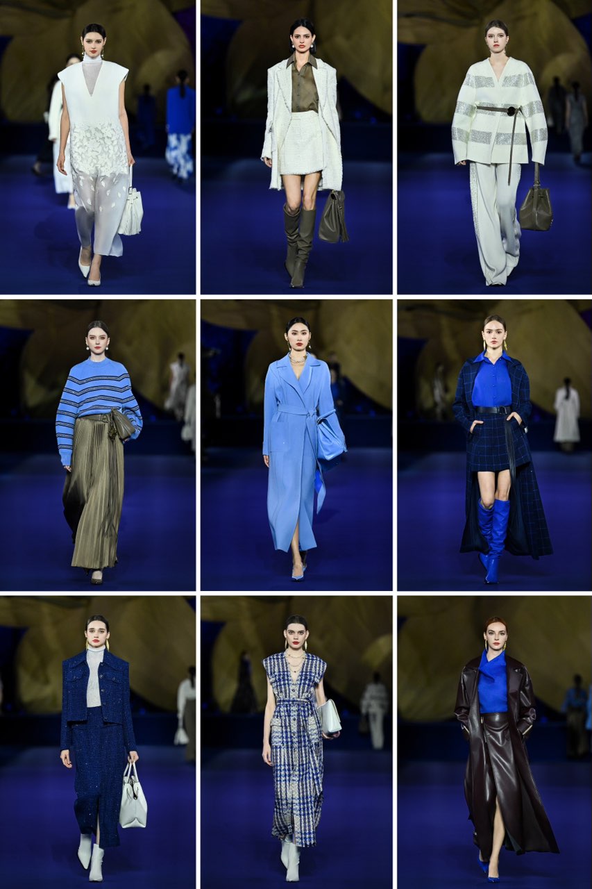 【时间的花】——圣星百合礼赞,致敬经典优雅,祈愿女性永葆本心,自在盛放。25度蓝着染圣星百合,再现品牌经典款、标志性工艺——NAERSI经典款真我套装、花瓣大衣以先锋设计回归、以经典致敬三十载优雅历程;【匠心盛开】——重瓣百合盛开,闲雅新生:以自信之姿,迎接每一次绽放。品牌经典花瓣领、经纬格纹,结合流行元素焕新演绎,线迹描摹女性柔韧并济的自信轮廓,赋予日常雅致逸趣;【赞许花冠】——鎏金百合加冕,华丽优雅:时光鎏金,荣耀嘉奖女性。栩栩如生的定位百合花、手工立体花,绽放于翩雅盛装,复现贵族优雅气质,映升高级时装的奢雅华光;【星耀前路】——宫灯百合熠耀,优雅高定:绽释女性永远向光生长,无龄感的态度,辉映当代女性自主璀璨的人生。高定礼服融蕴优雅工坊标志性柔光装饰,以精致珠钻、星光面料、立体装饰等细致匠艺——凝聚的大美鎏光,辉映女性隽美闪耀“从容、自在”的优雅精神。聚光灯下,质感细节传递臻装背后精准繁复的工艺表达与美学坚持。NAERSI在对过往的不断超越中,迈向充满多元构想的未来。