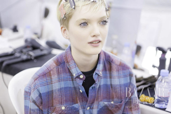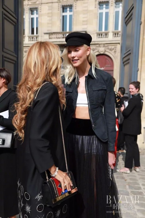 大秀门口,遇上一枚正在和友人聊天的大长腿Karlie Kloss。Croptop加纱裙的她帅气利落,当年那股超模的霸气依旧不减。
