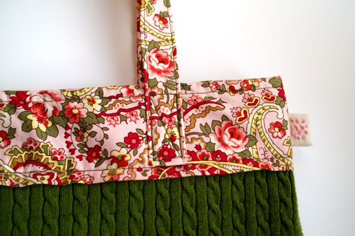 包包的长宽取决于你开始准备的毛衣大小,我们这里做的是15英寸宽,12英寸高。如上图所示,我们把毛衣下面量好尺寸后剪下来。