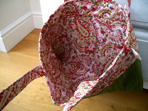我们给这个包包用印花布做一个内袋,这样包包不仅漂亮还更加实用。因为我的毛衣是15“×12”,我的印花布的尺寸15“×17”。因为最后要把上面长出来的印花布翻出来缝在外面。
