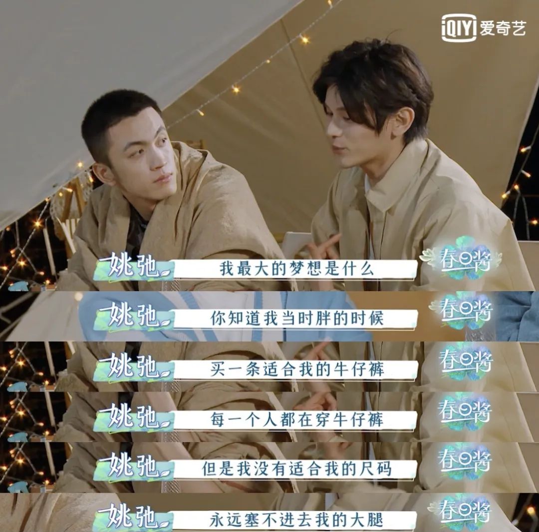 最近姚弛也在综艺上称自己有过外貌身材焦虑,自曝曾胖到过两百斤,以至于没有自信向身边的人提起自己想做歌手的梦想。说他甚至买不到合适的牛仔裤,试穿的牛仔裤“永远塞不进去大腿”。