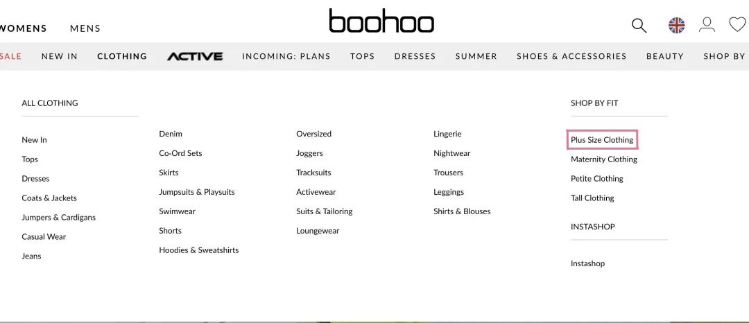 他们还非常贴心地为胖女孩设置了产品分类,进入官网www.boohoo.com首页,就可以在分类里找到。