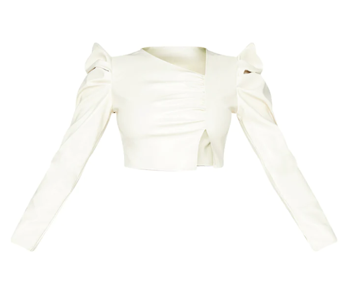 PrettyLittleThingCREAM PU RUCHED ASYMMETRIC NECK LONG SLEEVE CROP TOP 参考价格:£13