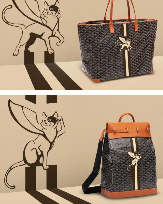 Goyard从其浩繁的历史档案中搜寻灵感:SUPER CAT宠物猫的设计原型来自Goyard复古目录中的一只猫咪,它幸运、神秘、矫捷且独立;而HULOT宠物犬的设计则是由Edmond Goyard先生的爱宠Hulot在1920年代主演的广告大片衍生而来。