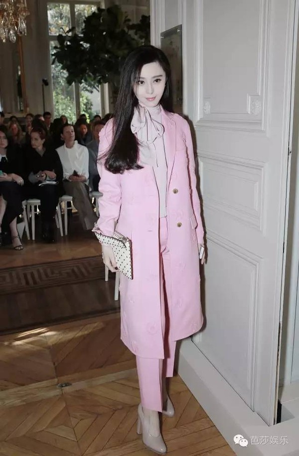 去看Valentino 2017春夏大秀的范爷穿了一身樱花粉套装,少女气息十足