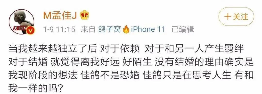随后,孟佳发文回应自己对于婚姻的态度:“当我越来越独立了后,对于依赖、对于和另一人产生羁绊、对于结婚,就觉得离我好远、好陌生,没有结婚的理由确实是我现阶段的想法。佳鸽不是恐婚,佳鸽只是在思考人生,有和我一样的吗?”