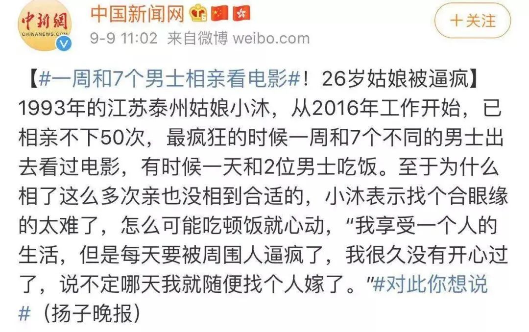 曾经微博上有这样一条新闻,一位1993年出生的姑娘,从2016年工作开始,已经相亲不下50次。
