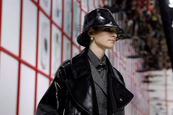 可以说没有人像Chiuri 一样那么支持上世纪九十年代年代的复古趋势,她在流行的渔夫帽上配了优雅的黑色网纱面纱,并且在内侧印上了Dior的monogram, 使其在摩登活力的基础上又有着高级优势。
