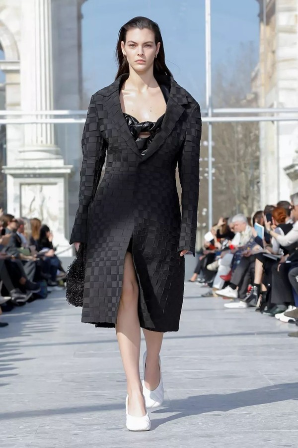 Daniel Lee的到来是对Bottega Veneta这个传统品牌的一次突破创新。在这次的2019秋冬成衣秀上,他对Intrecciato进行了突破性的尝试,在优雅收敛之外添加了暗黑叛逆,将Intrecciato作用在皮质外套形成类似于盔甲一样的坚挺造型。或是运用到超大尺寸的托特包和还有半裙,使图案有着一种紧密排列的数码美感。