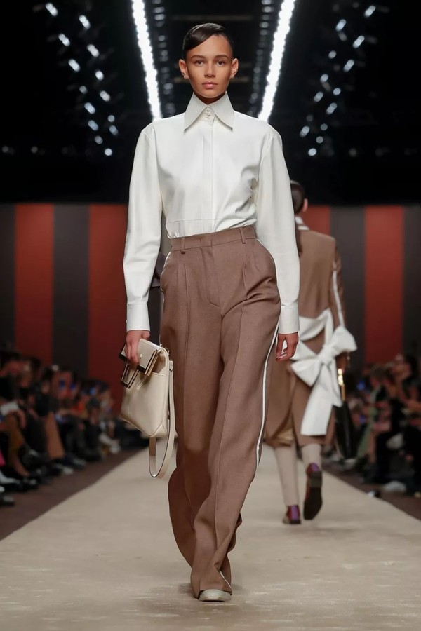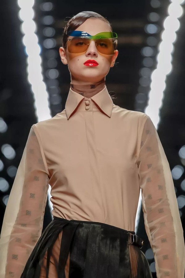 在Fendi秀场上回归的还有爱德华高领,Lagerfeld本人也热衷于爱德华高领,加上墨镜领带和黑色西装,这就是他带给我们的标志性形象记忆。