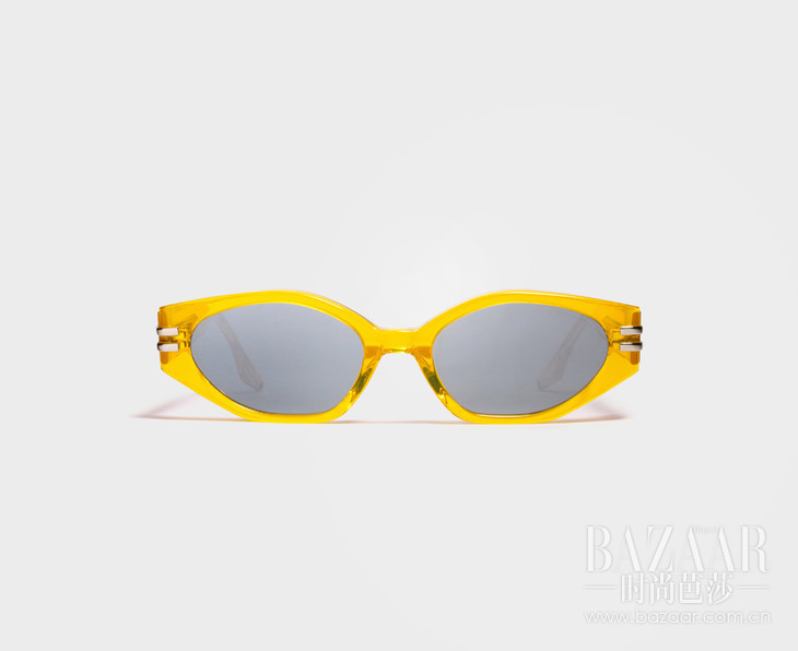 GHOST为六角形黄色透明细长板材太阳镜。镜框两侧连接到镜腿部位的金属装饰,为厚重的镜腿线条增添了时尚的美感。镜片提供有效UV防护。