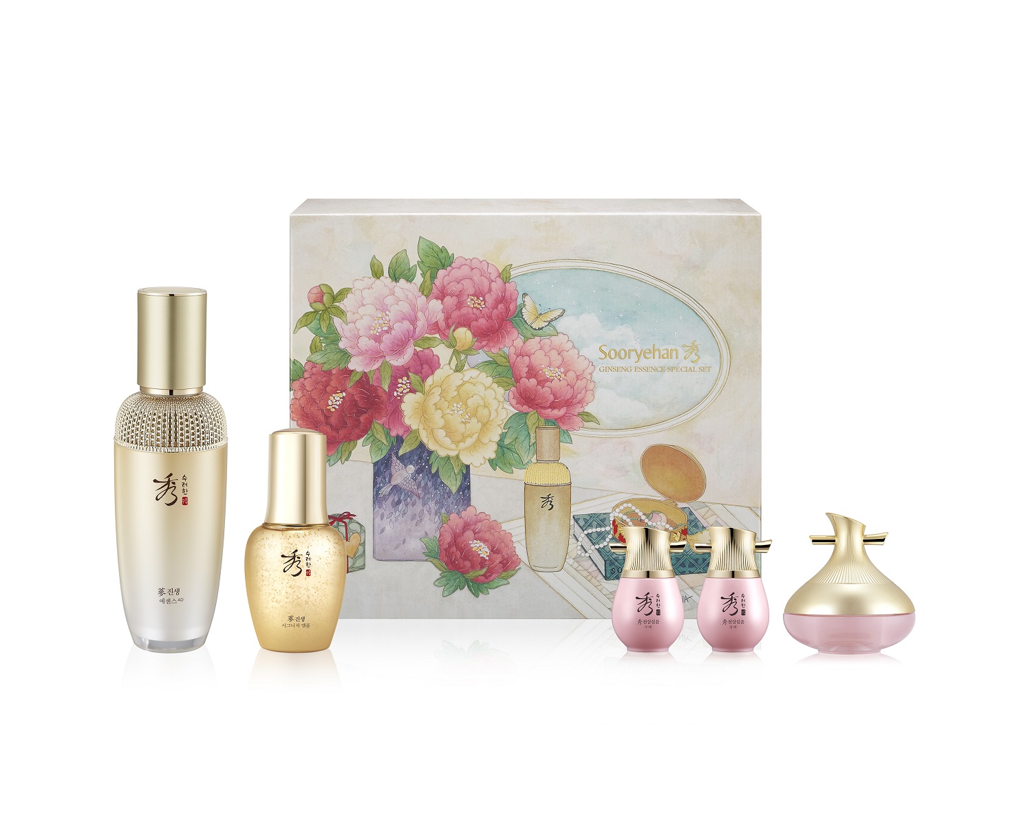 礼盒中还配有秀雅韩天参雪润亮肤水,秀雅韩天参雪润亮肤乳以及秀雅韩天参雪润面霜,天参雪润系列中蕴含人参提取物、梅花、卷丹、芍药精研而成,亮肤乳和面霜还添加抗氧化作用维他命E的植物提取物(沙棘果油、红花籽油、草棉籽油、杏仁提取物、茶叶油、向日葵籽油、亚麻籽油、大豆油)凝萃的本草Complex成分。