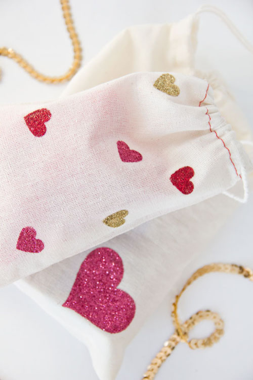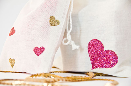 在纸条上压出桃心形状,将有桃心镂空形状的纸条放在收纳袋上,在桃心形状上涂抹胶水,最后撒上一些亮粉,等到亮粉固定好后,将纸条拿开,就完工啦!
