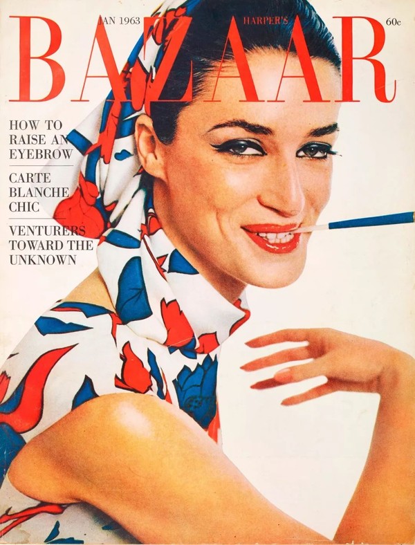 1963年,《Harper's BAZAAR》1月刊,封面模特的造型显然致敬了Diana Vreeland标志性形象,头巾,烟斗,甚至还有她富有特点的鼻子。