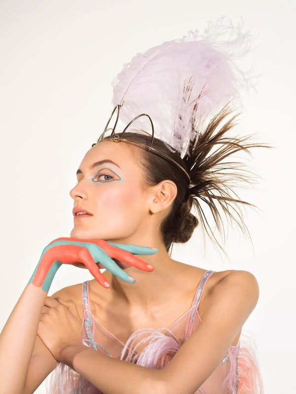 羽毛头饰、吊带连衣裙 均为Nina Ricci
