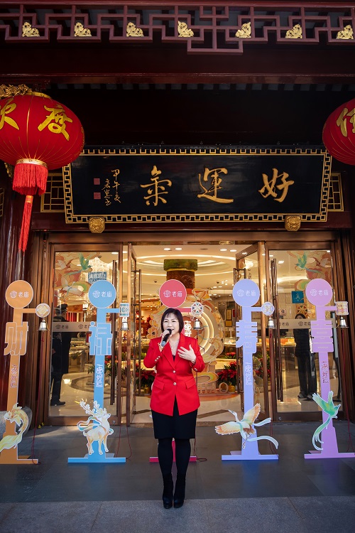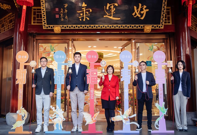 启动仪式当天,豫园珠宝时尚集团联席董事长兼CEO张剑先生,豫园珠宝时尚集团执行总裁兼首席运营官丁胜利先生,豫园珠宝时尚集团副总裁李国臣先生,豫园珠宝时尚集团副总裁岑佳女士,与麦玲玲女士共同敲响象征好运的新年铃声,正式开启老庙LuckyWalk好运道快闪活动。
