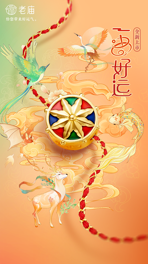 为情绪加油,为梦想充电。老庙一串好运全新系列,从东方文化中汲取灵感,以新中式审美具像化呈现老庙好运文化,将五运概念与传统祥瑞意像相结合,陪伴积极向上的年轻人将心中的小小期待寄情于物,积极寻求向上的力量,追逐生活中的小确幸。