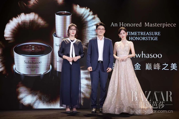 从左至右:雪花秀芊萃鎏金系列见证者易立竞、中国雪花秀CTO常务兼品牌总经理朴京隽、雪花秀品牌优雅大使张嘉倪