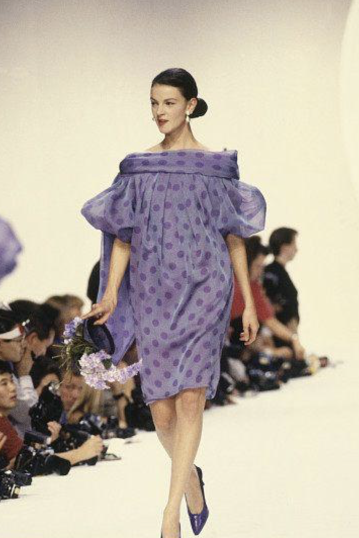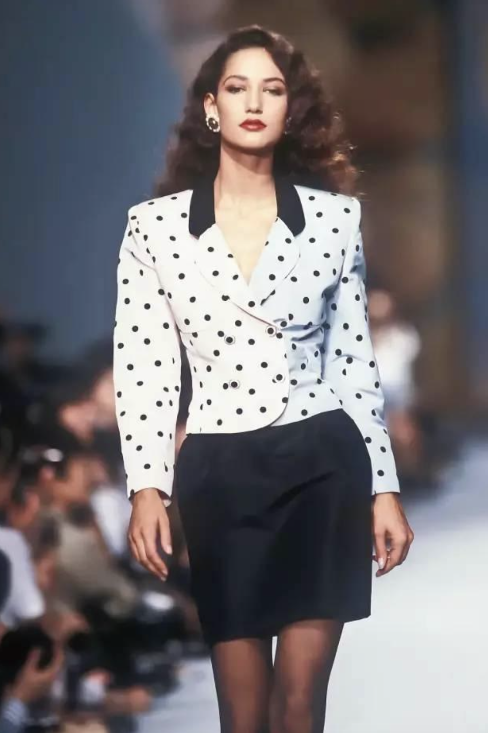 而20世纪90年代的波点也成为了各大T台上的时尚宠儿,几乎隔一两年就要登场一次,不管是连衣裙还是西装外套等,因为波点的陪衬,都把女性的优雅发挥到了极致。