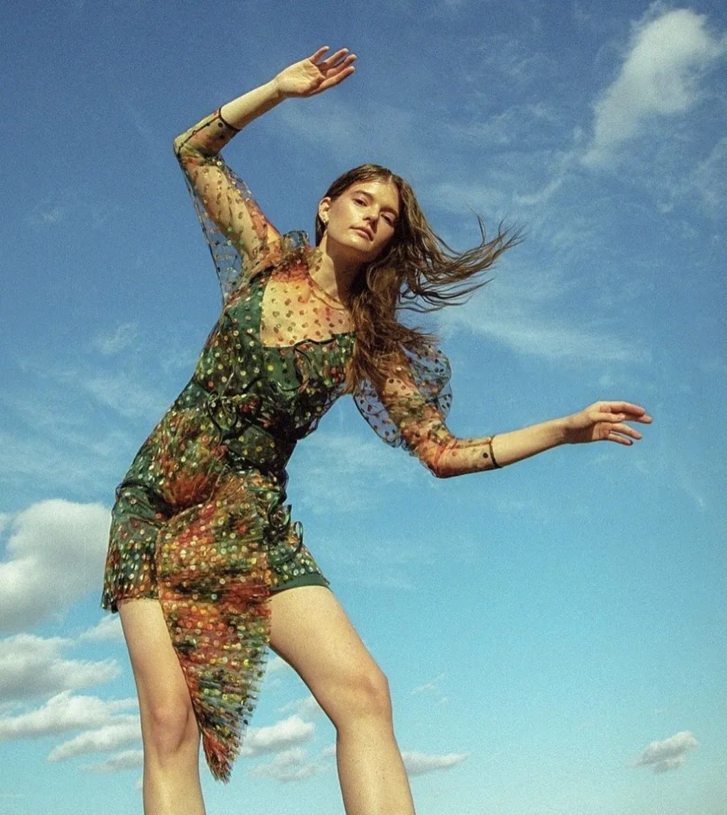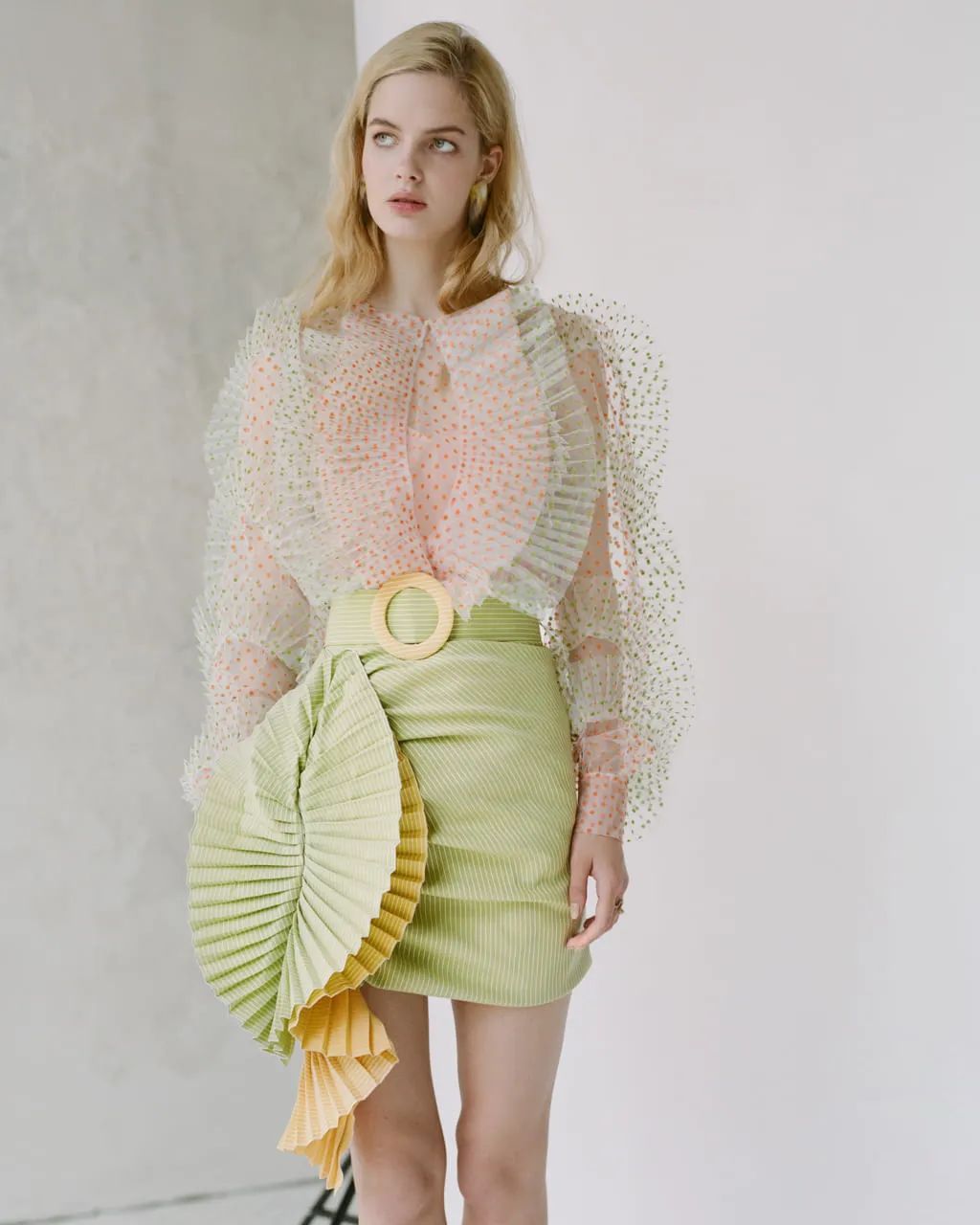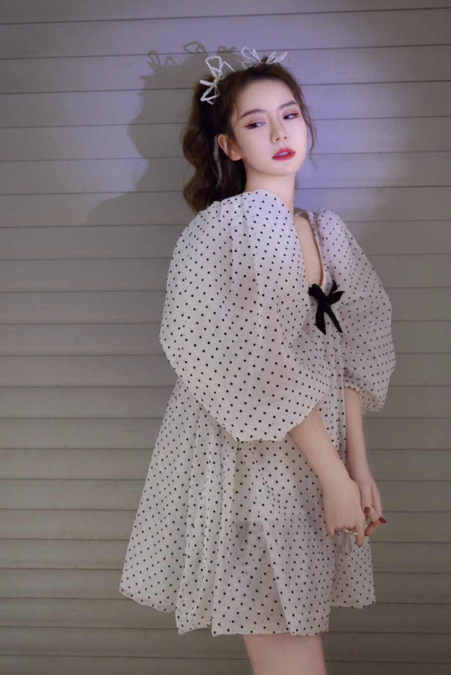 不对称的连衣裙结合了彩色的波点、泡泡袖和荷叶边等元素,除了带有少女感,还更多了分仙气。