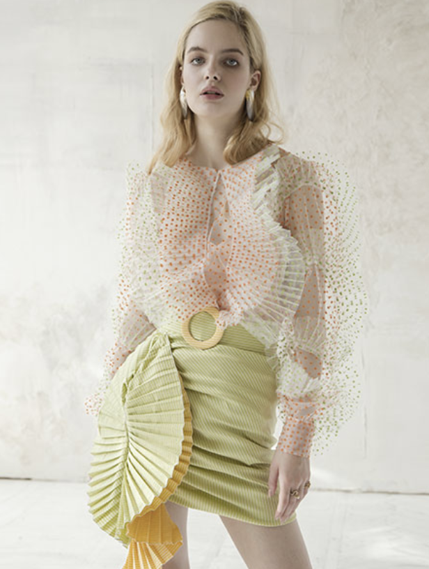 设计师Alana Johnson也非常擅长使用褶皱、绑带等元素设计,整体的线条感在波点的作用力下也很柔和,妥妥地展现了细腻的女性魅力。