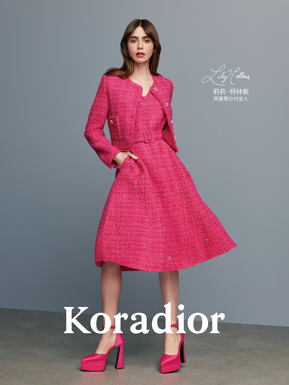 在珂莱蒂尔Koradior全新的秋季形象大片中,莉莉·柯林斯Lily Collins以其对时尚的驾驭力与珂莱蒂尔Koradior展开一场浪漫女人味的探索之旅。品牌色玫红以其明媚、热烈,极富梦幻氛围的感度成为本季大片的主基调,将玫瑰精髓融入品牌核心品类裙装之中,莉莉·柯林斯Lily Collins身穿玫红色格纹肌理粗花呢套装,以经典V领设计展现浪漫之姿;在经典K dress的玫瑰蕾丝印花焕新下,勾勒出女性动人曲线;以“玫瑰晶”点缀的赫本风小黑裙典雅奢华……浪漫天成的莉莉·柯林斯Lily Collins通过这一季形象大片,充分展现了当代女性极致的浪漫形象。