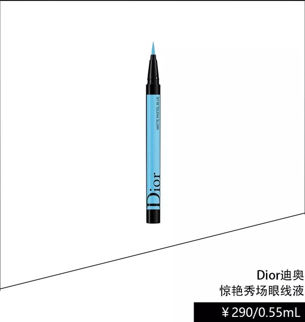 Dior这款惊艳秀场眼线液从校园女生挚爱的糖果蓝中汲取灵感。用笔锋勾勒出大胆的线条,充满几何美感。鲜艳的色彩与眼影极易搭配,让眼妆如冰沙般清新。