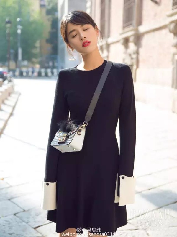 马思纯在这次米兰时装周上就穿着SportMax 2016早秋系列的连衣裙,简单的修身连衣裙由于拼接的袖口简约又有设计感,搭配一只毛毛装饰得斜跨小包,显得气质干净而优雅~
