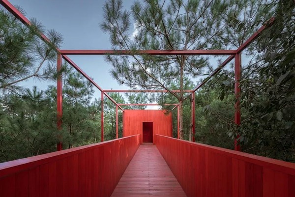 对于这间位于安徽齐云山风景区内的单间旅馆客房——“松间长屋”来说,整个建筑小巧修长,其核心的亮点就在于这条进入屋内必经的长廊。长廊周围采用空框的结构,使松林的枝桠得以“入侵”进来,充满闲情野趣;而长廊内的穿行体验则浸入式地暗示了人与自然的关系:既是静止的“观”、亦是逍遥的“游”,并且为接下来的隐居生活增添了朴素的仪式感。