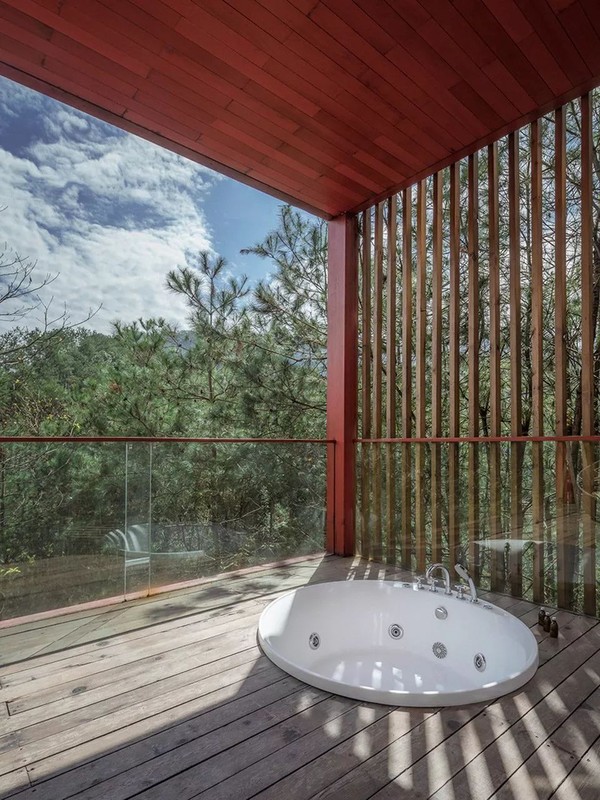这指的是,设计师为了使居住者获得融入自然的原真性体验,往往会模糊建筑与周边自然物(树木、岩石等)的界限。明明是私密性极高的独居建筑,内部空间却是向外部开放的;而这种二重性恰恰建立在山中去社会化(没有人)的特点之上。具体体现在:居所中最具私密性,也往往是最封闭的空间,如卧室、浴池等,周围都会采用玻璃材料;或是不加任何围挡,完全地裸露在大自然的瞩目之下。