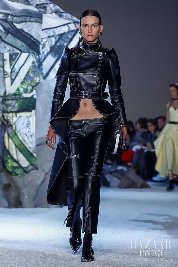 撇去西装套装,纯皮衣套装酷劲加倍。Alexander McQueen 2018 秀场上这套皮衣套装,在帅气中融入荷叶边的少女气息,风格多元,时髦轻松 Get。