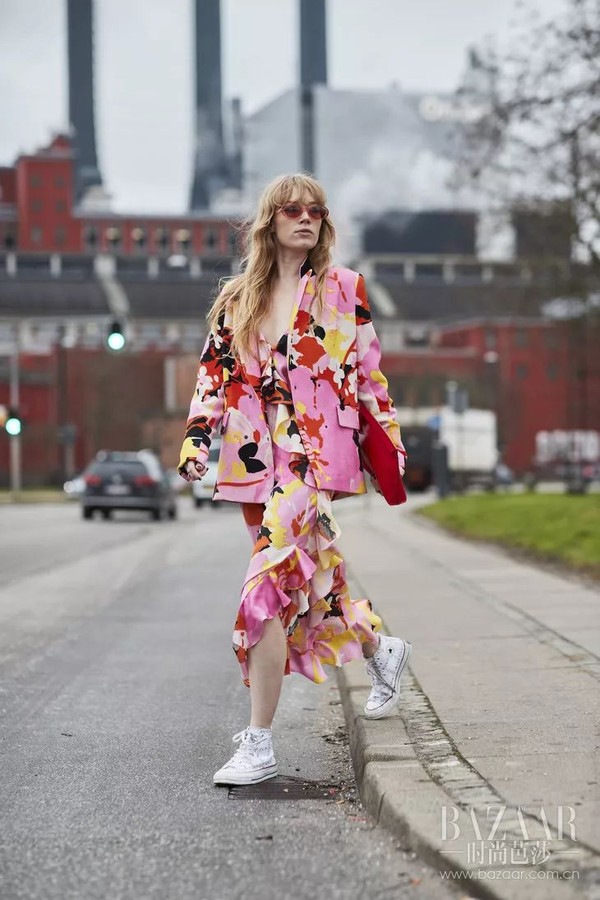 那印花当然不只是小印花,还有这种狂野绽放的花卉印花,大面积地占据整件衣服,配上明艳的色彩,格外出彩。这种比较花哨的套装,穿上一双白鞋就能很好地平衡色彩。