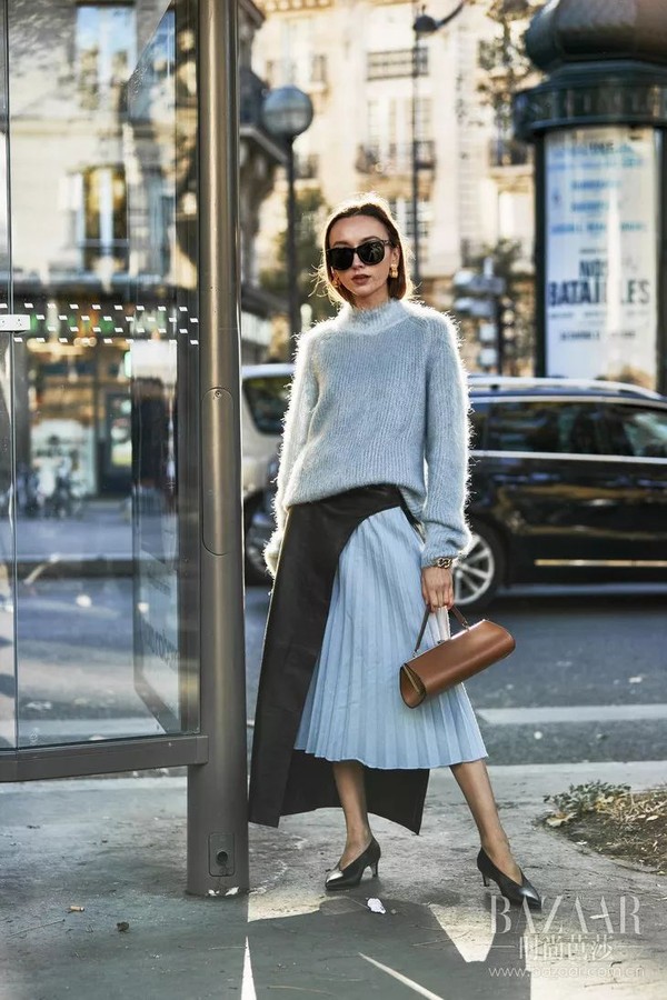 或是用不同特性的面料撞出个性与新意,针织毛衣与轻薄的百褶长裙的套装搭配,毫无违和感。兼顾风度与温度的个性时髦,是时装精必备的套装 DIY 技巧。