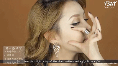 沿颧骨45°角以打圈方式修容,一直到下颚,比较肉肉的部位可以多扫一点~