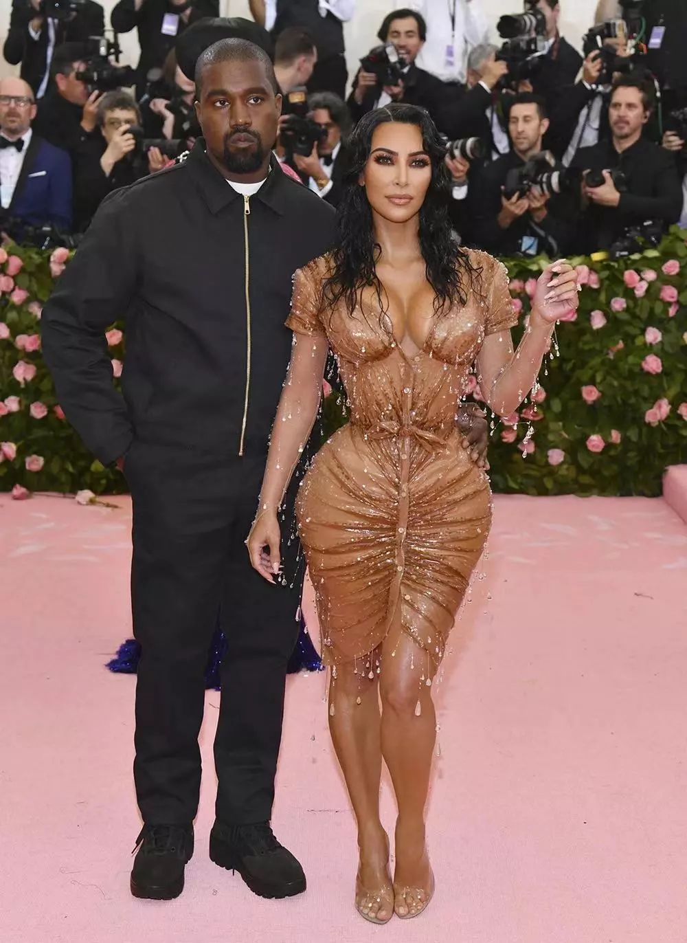 Kim当晚一身“湿身装”亮相,有种出落水面的感觉,身着Thierry Mugler设计的礼服。为了穿上这件难以置信的紧身胸衣,Kim进行了大量的锻炼和禅修。