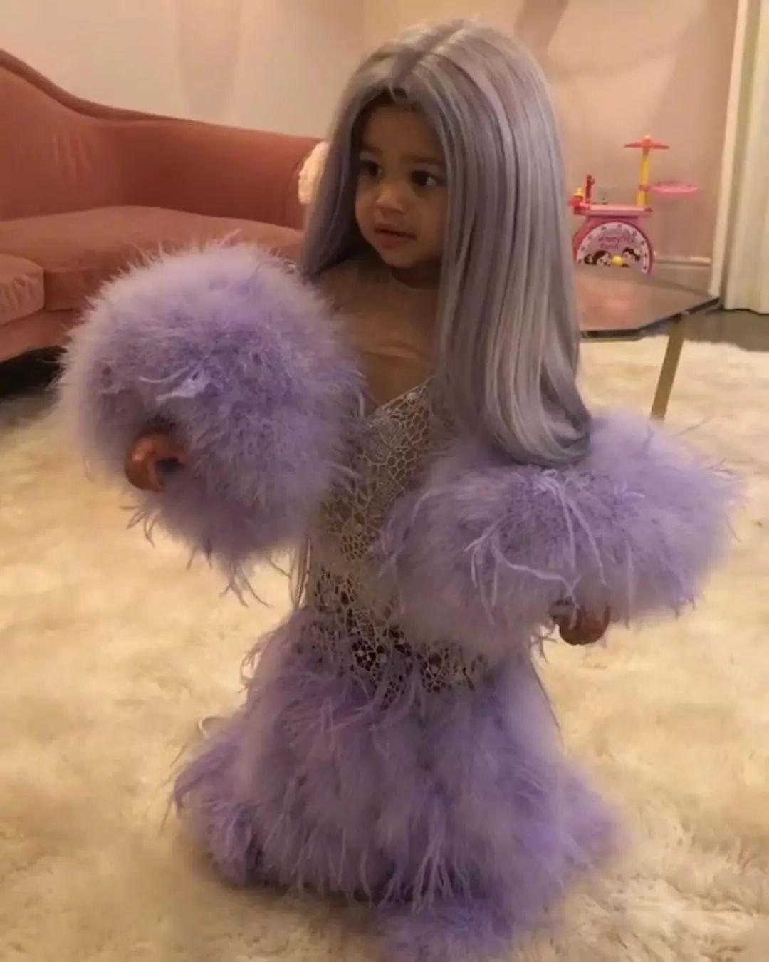 晒娃狂魔Kylie也给女儿Stormi打造了自己同款造型,这只小可爱把芭姐萌化了,简直就是mini版的Kylie。