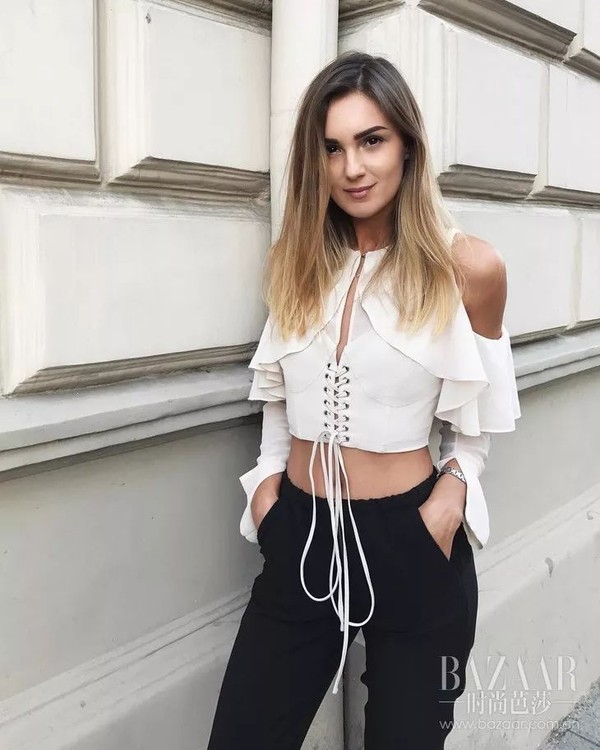或者可以像宇博Chiara这样用短款削肩上衣来搭配高腰裤,不仅能把该遮的副乳和腰间赘肉都遮住,还能通过腰间最细的一截与肩头形成呼应,性感又显瘦~