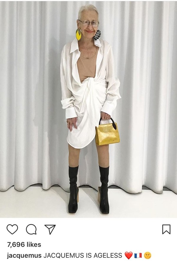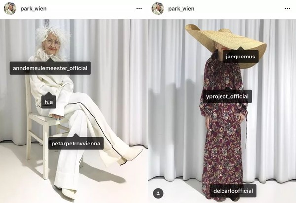 park_wien是一个instagram账号,账号上经常分享一个白发老太太的穿着最当下设计师诸如Y/project,Jacquemus,Rafsimons……的衣服,她叫Ernestine。今年已经95岁超高龄的她是奥地利一间开业至今已有13年的时尚买手店Park的御用模特。