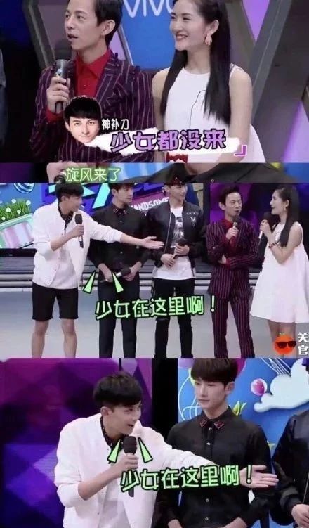 在《快乐大本营》主持人何老师提问到:“旋风少女,来得怎么都是旋风,少女都没来!”三石弟弟反应超快的指着谢娜说:“少女在这里啊!”