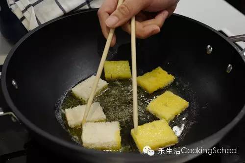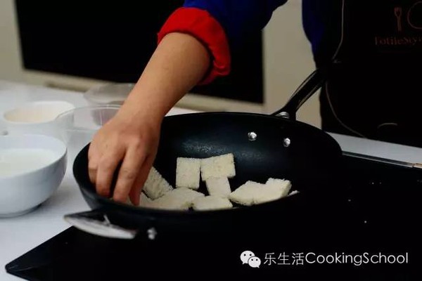 Step 1吐司片去掉四边,切成小方块,用平底锅煎脆略焦。(可以先预热烤箱,温度200。)