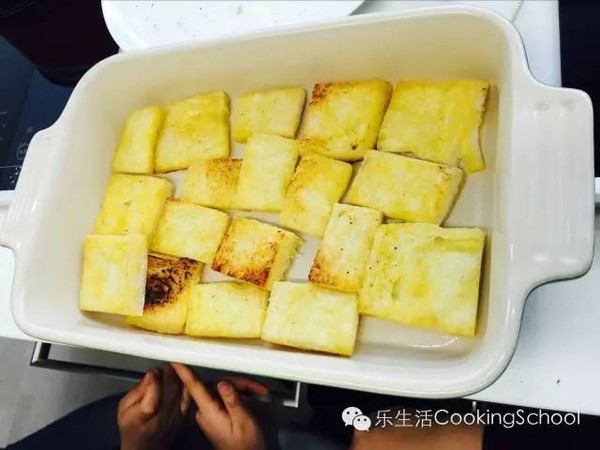 Step 2 平底锅融化黄油后关火,将吐司片趁热蘸上黄油,码放在焗盘中。