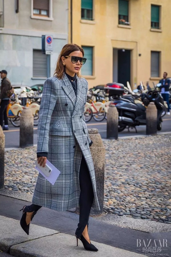 贴身款格纹外套,有腰线,当然十分优雅,但同时也比较挑身材。