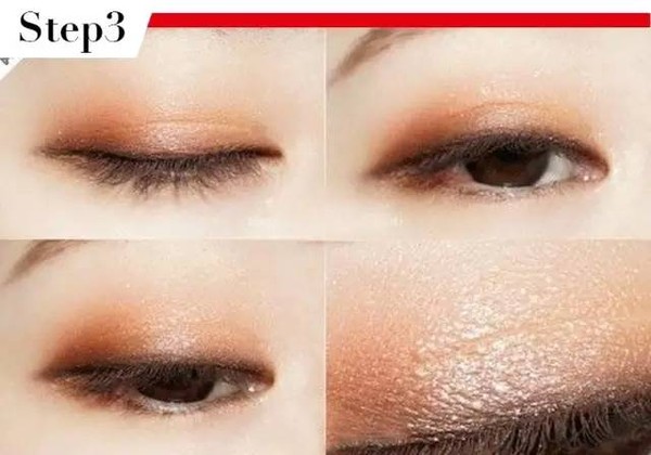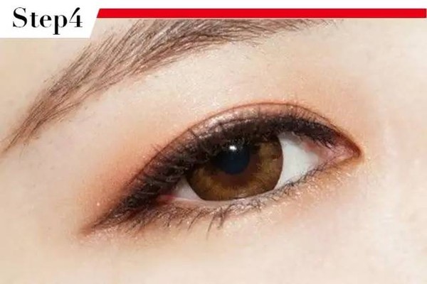 然后画一条棕色的内眼线并拉长眼尾,再用金棕色加深一下睫毛根部和眼尾的眼影,别忘了涂下眼影,涂在下眼睑后三分之一处就行啦。