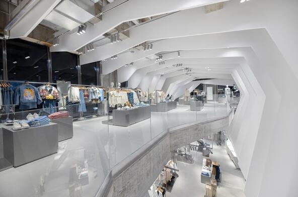 UR大上海时代广场店以“都市剧院”作为空间设计的灵感来源,从外部构造、色彩搭配、内部装饰、陈列展示等各方面诠释这一概念。店铺正面紧邻繁华街道,侧面则面向幽静小路,从两种不同角度展现出创作者的设计巧思:站在店铺正面时,呈现眼前的是店内错落有致的多层几何结构,犹如层层重叠的剧院帘幕;而从侧面看到的景象则仿佛帘幕之下的剧院后台,令人充满无限遐想。更特别的是,店铺首层以“室内街道”为设计概念,与店外川流不息的淮海路恰好平行,顾客在陈列服饰之间穿行时将获得“动静结合”的沉浸式体验。
