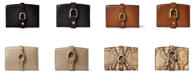 女士小型皮具包括卡片套及经典Ralph Lauren短钱包,备有RL黑色、棕色及香槟色皮革款式,以及蟒蛇皮纹款式。系列亦推出附有搭带的钱包和连斜背带的手机套,备有RL金色、黑色、蟒蛇皮及银色蛇皮款式,是Ralph Lauren女郎的实用之选。所有款式均于正面饰以银色马镫细节。