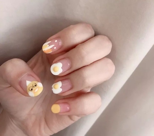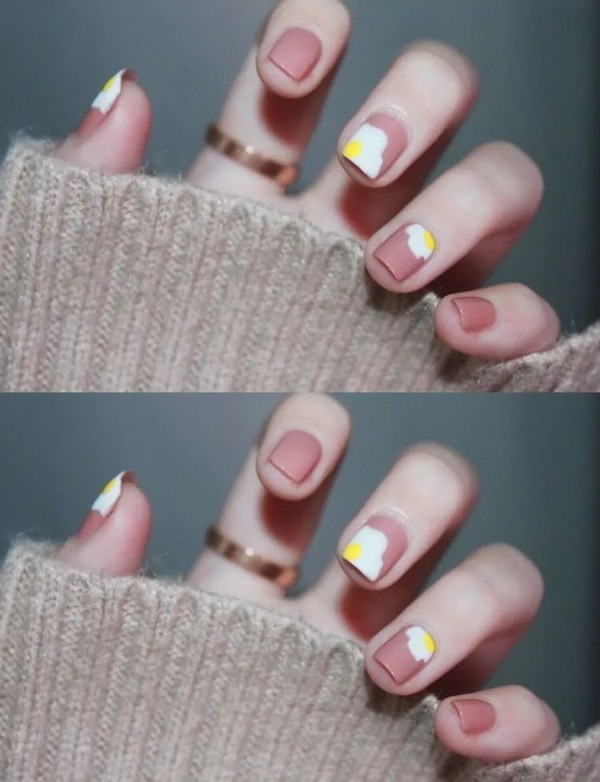 放大一看,指甲上的荷包蛋也太可爱了吧!充满童趣又没有幼稚感,还有种QQ弹弹的质感,超级适合春天了。