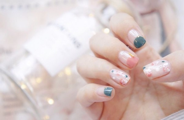 还可以把底色做成纯色,与花色相呼应,诗意又气质,特别韩范,也非常适合用来做新娘美甲。