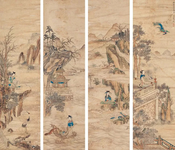 冷枚《仕女》,四屏、设色纸本,100×28cm,清代