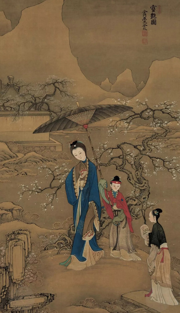 冷枚画中的仕女在其精致的刻画下拥有了独立的性格,如同现实世界中的人类,似乎都追随着各自的独立灵魂而生。从凌驾于云端的神仙到藏匿于深闺中的女子,神态身姿都堪称独一无二。