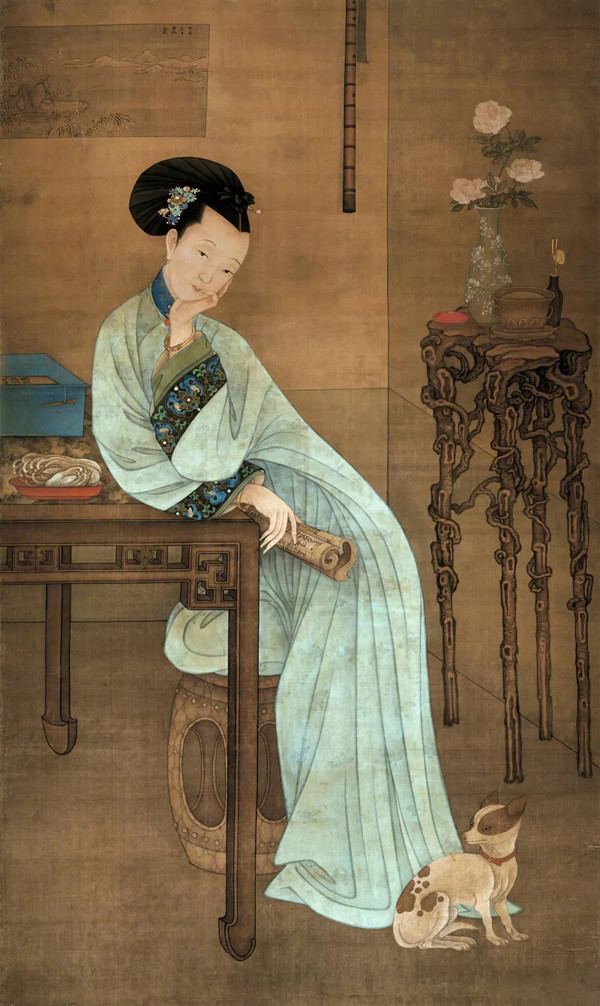 这幅绘于雍正时期的《春闺倦读图》,将古时大家闺秀的清闲寂寞生活呈于卷上。身着一袭长裙的仕女发髻高挽,侧身倚桌案而立,文静闲适的神态中略带倦意,与其膝下灵动可爱的小狗形成了静与动的对比。